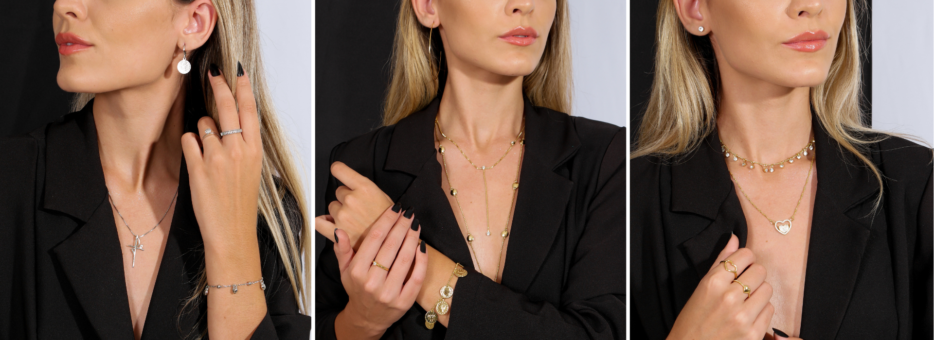 Trabalhamos com materiais de alta qualidade, incluindo aço inoxidável premium com banho em Ouro 24K, ouro branco (ródio). Nossas semijoias recebem 10 camadas de ouro 24K, garantindo brilho intenso, maior resistência e acabamento refinado.